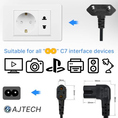 - التوافق: يمكن استخدام سلك الطاقة العالمي للتلفزيون C7 ذو الزاوية اليمنى مع قابس الاتحاد الأوروبي المسطح للعديد من أنواع الأجهزة الإلكترونية، مثل تلفزيون LED وتلفزيون HD والأقراص الدوارة وأنظمة الترفيه الصوتية والفيديو ووحدات التحكم في الألعاب والمصابيح ومحولات الشحن والإلكترونيات. الأجهزة والملحقات..