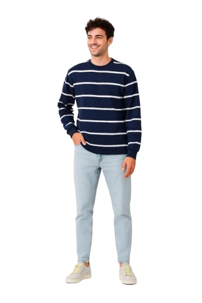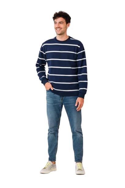 AJYAL - سويت شيرت كلاسيكي مخطط برقبة دائرية ضيقة من اجيال، أزرق كحلي مع خطوط بيضاء، مزيج من القطن، نمط كاجوال، كم طويل