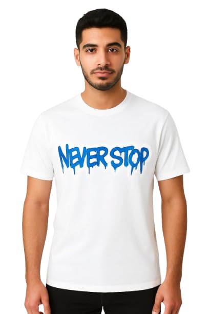 AJYAL - تي شيرت رجالي من اجيال، تصميم مطبوع عليه عبارة Never Stop، كاجوال من القطن بقبة دائرية بدون طوق