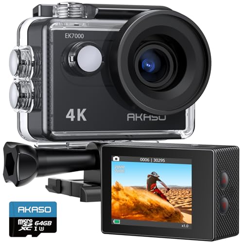 AKASO - اكاسو كاميرا اكشن EK7000 4K30FPS 20MP UHD تحت الماء بزاوية واسعة 170 درجة مقاومة للماء 98 قدم تدعم الميكروفون الخارجي (اسود+64)