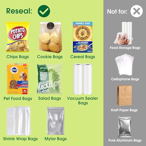 - مناسبة لإغلاق العديد من العبوات. مناسبة لإغلاق أكياس الشيبسي والبسكويت والسلطات وأطعمة الحيوانات الأليفة وغيرها. متوافقة أيضًا مع الأكياس المفرغة من الهواء، مما يجعلها أداة ضرورية لأغراض الطهي اليومية في المطبخ. غير مناسبة لستريتش التغليف وأكياس السيلوفان وورق الكرافت والأكياس المصنوعة من الألومنيوم الخالص.