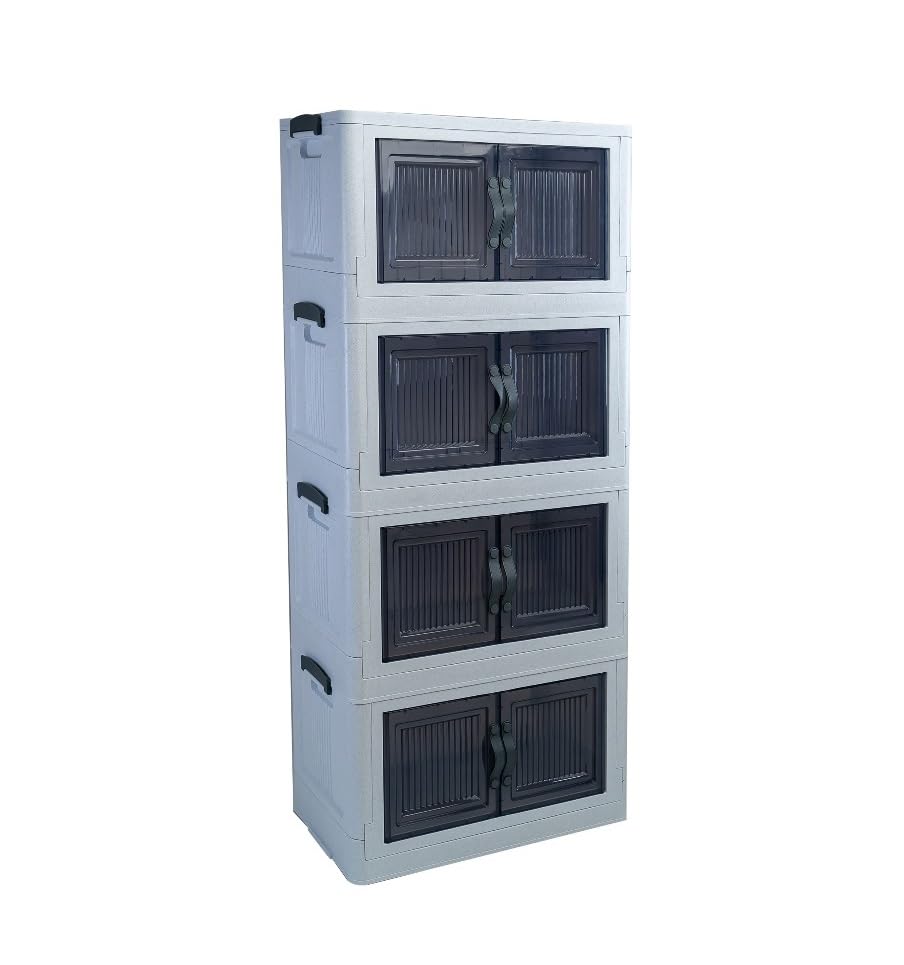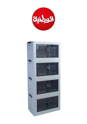 AKSA - خزانة تخزين من 4 طبقات من اكسا، تصميم باب مزدوج، نظام تنظيم قابل للتكديس مع مقابض مقبض، رمادي