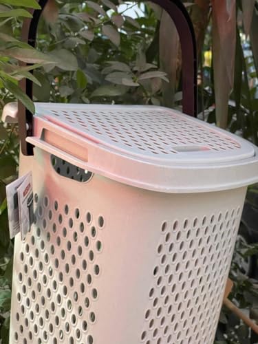 - سلة غسيل بلاستيكية بمقبض وعجلة من اكسا، 60 × 50 سم - ابيض مع مقبض بني.