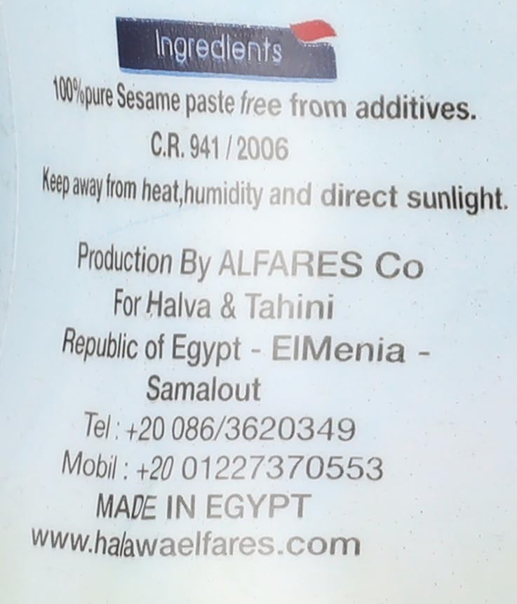 - طحينة عالية الجودة مصنوعة من السمسم الطبيعي بدون أي مكونات ضارة.