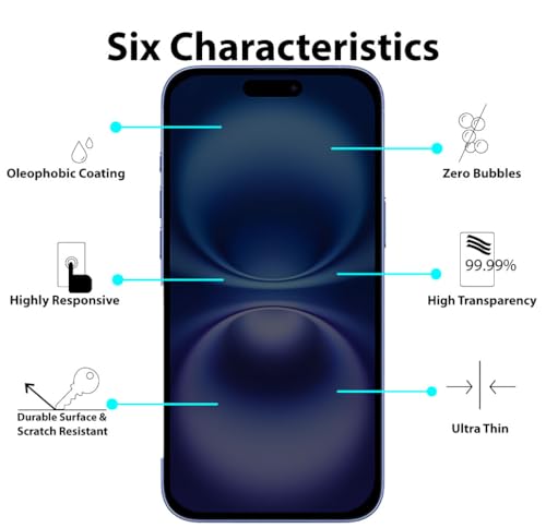 - [التوافق] مصمم لموبايل ايفون 16 6.1 بوصة لحماية كبيرة. ملاحظة: لا يناسب ايفون 16 بلس / 16 برو / 16 برو ماكس. مصممة بحواف منحنية 2.5 دي مدروسة، متوافقة مع معظم