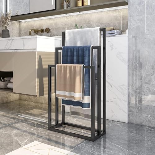Generic - حامل فوط معدن قائم بذاته من التميز المعدني، منظم 3 ادوار لتخزين الفوط وتنظيمها بجوار الحوض او الدش، يحمل فوط اليد والحمام، (اسودرف فوط معدني أسود من 3 طبقات، حامل فوط قائم بذاته للحمام