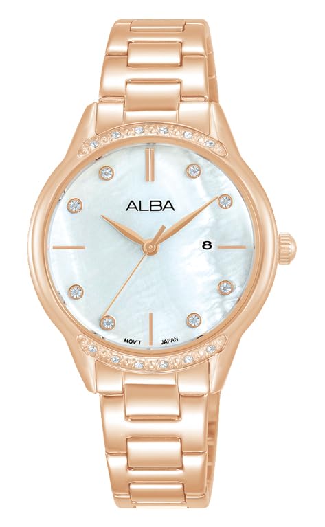 Alba - البا ساعة انالوج عصرية من الستانلس ستيل للنساء، عرق اللؤلؤ ابيض/ذهبي وردي، AH7AP4X