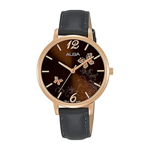 Alba - ساعة عصرية بسوار جلدي ومينا بنمط فراشة وحركة انالوج للنساء - اسود وروز وذهبي، من البا
