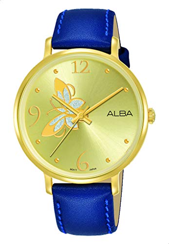 Alba - ساعة انالوج انيقة مزينة بفراشات وكريستالات بسوار من الجلد ومقاومة للماء للنساء من البا طراز AH8612X - لون ازرق داكن
