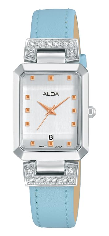 Alba - البا ساعة يد عصرية بسوار جلدي للنساء، مقاس الهيكل 21 ملم، رمادي فاتح/ازرق