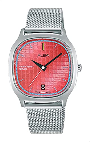 Alba - ساعة يد فيوجن أنالوج بعقارب ومينا منقوشة وسوار شبكي من الفولاذ المقاوم للصدأ للنساء من البا، لون فضي وأحمر