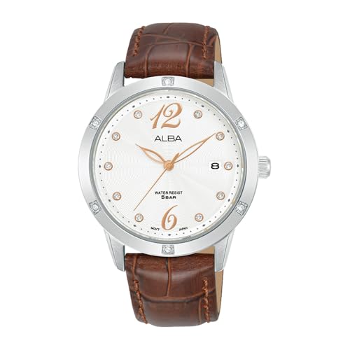 Alba - ساعة عصرية بسوار من الجلد ومينا منقوش باللون الأبيض والفضي للنساء من البا، موديل AG8N17X