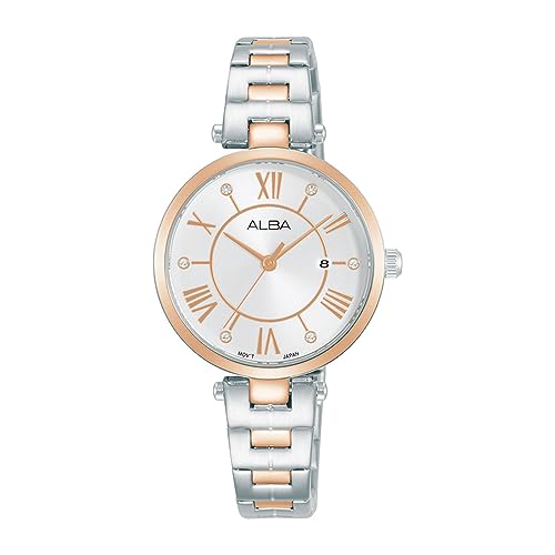 Alba - ساعة عصرية للنساء من البا مصنوعة من الفولاذ المقاوم للصدأ مينا بلون أبيض وفضي مطلية بلون ذهبي وردي، موديل AH7AN4X