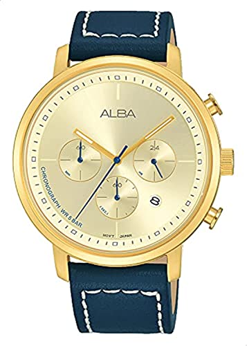 Alba - ساعة برستيج أنالوج للرجال من ألبا، بعقارب وعرض كرونوغراف، مع سوار جلدي ومينا ذهبي، موديل AT3D60X1