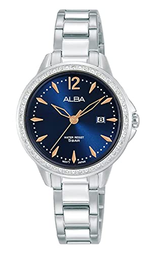 Alba - ساعة يد عصرية للنساء من البا تعمل بنظام عرض انالوج بعقارب بمينا ازرق وسوار الستانلس ستيل موديل AH7AB9X1 أزرق