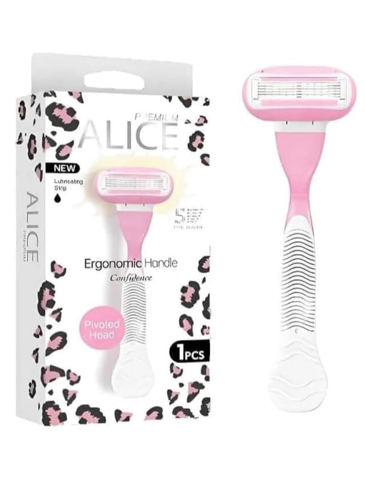 Generic - ماكينة حلاقة بريميوم اليس للبشرة الحساسة من 5 شفرات بمقبض مريح ورأس محوري وشريط ترطيب للنساء من 1 قطعة بلون وردي وأبيض موديل AS-24 من اليس