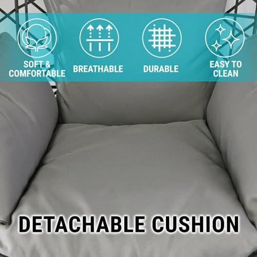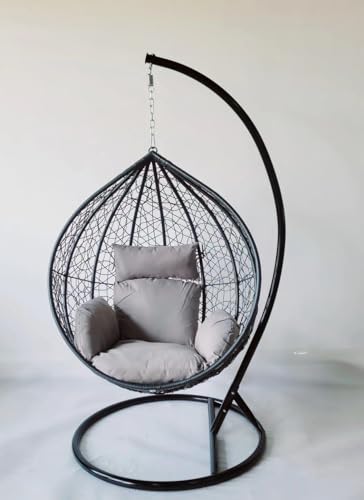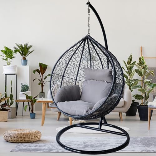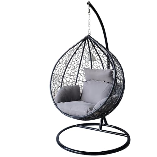 Alivio - كرسي معلق بتصميم بيضاوي من الراتان، كرسي سلة كبير مع وسائد، كرسي أرجوحة للأماكن الداخلية والخارجية والفناء والحديقة، كرسي قائم بذاته مقاوم للطقس بلون رمادي مقاس 1.96 × 1.20 م من اليفيو