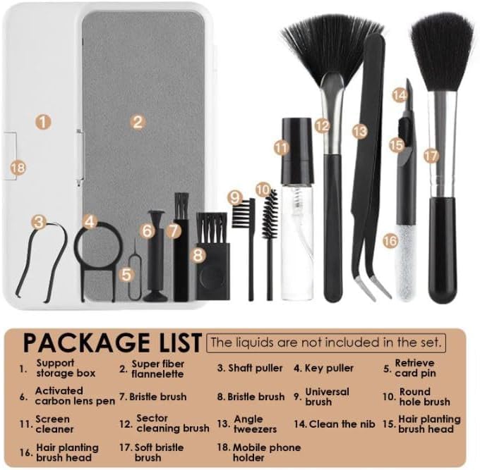 - 【مجموعة شاملة من 19 قطعة】تتضمن هذه المجموعة 19 أداة دقيقة مثل الفرش والفوهات والمسحات وأقمشة المايكروفايبر للتعامل مع كل زاوية وركن على الهواتف وأجهزة اللاب توب والكيبورد والشاشات وسماعات الأذن بسهولة وكفاءة