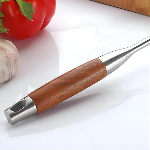 - تتضمن مجموعة أدوات المطبخ متعددة الوظائف هذه ملعقة تقليب مصنوعة يدويًا من الستانلس ستيل وملعقة مشقوقة، كلاهما بمقابض خشبية على شكل كمثرى مقاومة للحرارة، مثالية للطهي أو التقديم أو إهداء الهدايا لعشاق الطهي أو الأحباء الذين يقدرون الأدوات القوية والأنيقة.