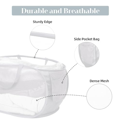 ALMEKAQUZ - سلال غسيل متينة قابلة للطي من الميكاكوز، سلة غسيل شبكية منبثقة مع جيب جانبي، سلة تخزين ملابس قابلة للطي مع مقابض حمل للغسيل او الحمام او المسكن او السفر، لون رمادي