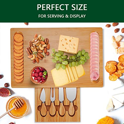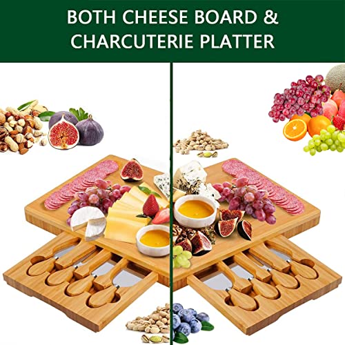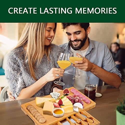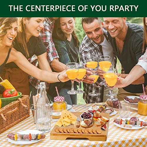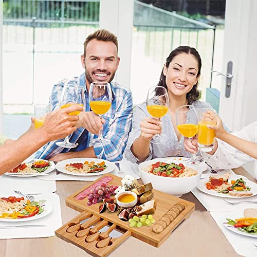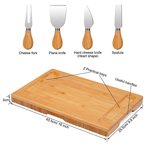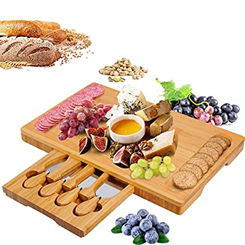 ALMEKAQUZ - لوح جبن من الخيزران الميكاكوز صينية طبق لحم فحم مناسب لتقديم الجبن النبيذ المكسرات اللحوم والشاركوتيري مع مجموعة 4 قطع ادوات المائدة وسكاكين بامبو مستدير