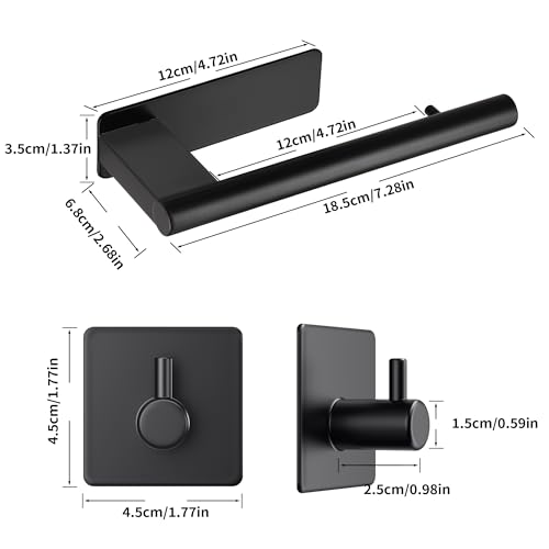 - أبعاد المنتج: تتضمن العبوة 1 حامل ورق تواليت أسود غير لامع: 18.5 × 12 × 6.8 سم؛ خطافين للمنشفة: 4.5 × 4.5 × 2.5 سم