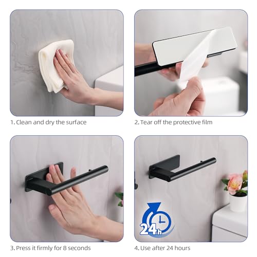 - تركيب سريع: بدون ثقب. ما عليك سوى تقشير الغشاء الواقي من الوسادة اللاصقة، ولصق حامل ورق المرحاض أو خطاف المنشفة على الحائط واضغط عليه لبضع ثوانٍ. يمكن وضع حامل ورق المرحاض الأسود ليس فقط أفقيًا، ولكن أيضًا رأسيًا، مما يوفر لك المساحة