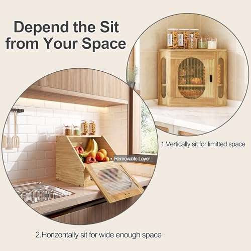 - صندوق تخزين من الخشب متعدد الوظائف: صندوق التخزين لا يقتصر على حفظ أنواع الخبز المختلفة فحسب، بل يمكن استخدامه لأغراض تخزين متعددة في المطبخ، مثل حفظ الفواكه، البسكويت، البيتزا، السندويشات، وعبوات التوابل المتنوعة. يمكن وضعها بالقرب من ماكينة القهوة في بار القهوة لتخزين كبسولات القهوة وأكواب كيه وأكياس الشاي وما إلى ذلك، استمتع بوقت الفراغ بشكل أفضل. إذا كنت بحاجة إلى مساحة كبيرة جدًا، يمكنك إزالة الرف الأوسط ووضعه عموديًا لتخزين كميات كبيرة من البصل والبطاطس.