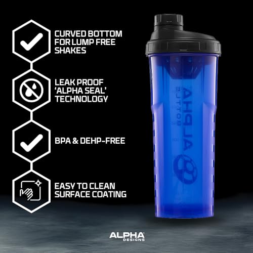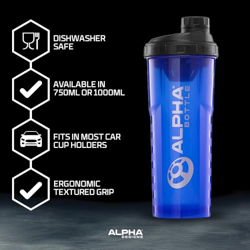 Alpha Designs - زجاجة شيكر للبروتين من الفا ديزاينز، سعة 1000 مل| زجاجة شيكر للجيم لخليط البروتين | لون أزرق