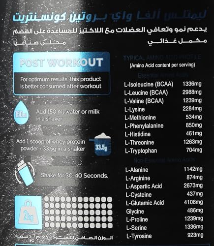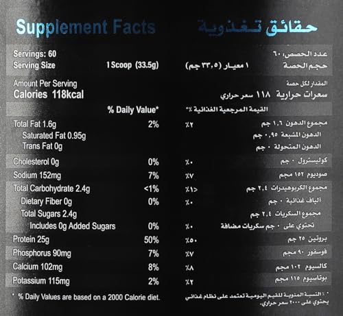 - يحتوي على 25 جرام من بروتين بناء العضلات و5.5 جم من الأحماض الأمينية الطبيعية المشبعة و4 جم من الجلوتامين