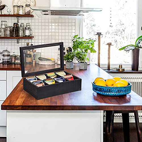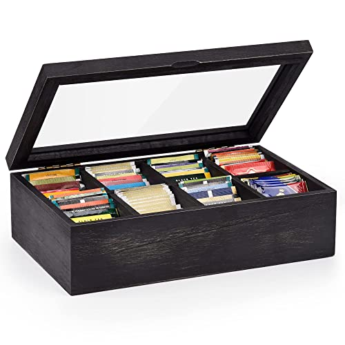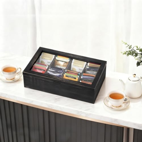 Alsonerbay - منظم علب الشاي، صندوق تخزين أكياس الشاي للمطبخ الخشبي لتنظيم أكياس التوابل وعبوات السكر مع 8 مساحات تخزين وغطاء زجاجي شفاف من السونيرباي، أسود