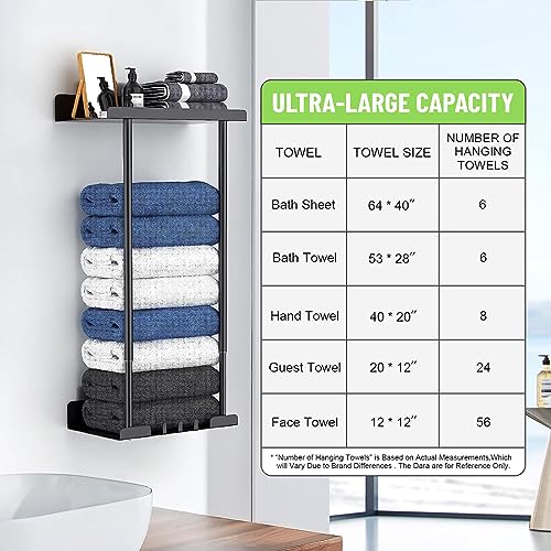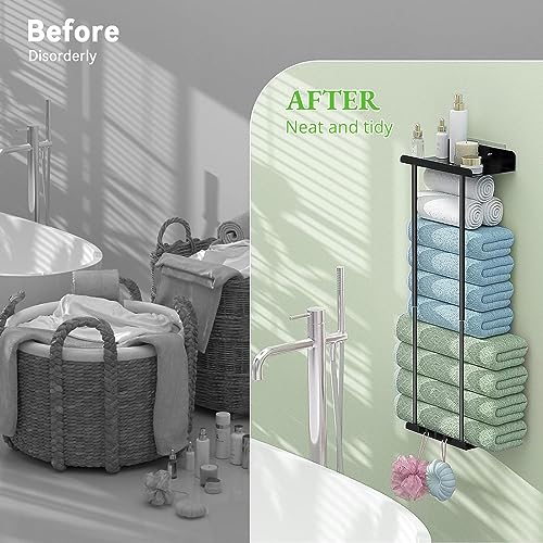 - سعة كبيرة: يبلغ مقاس رف المناشف المثبت على الحائط 75 سم (أقصى ارتفاع) × 26 سم ويبعد 15 سم عن الحائط. يمكنه حمل ما يصل إلى 7 مناشف حمام ذات حجم عادي، كما يضيف رف المناشف المثبت على الحائط أرفف تخزين و3 خطافات، مما يجعل من السهل وضع وتعليق مستلزمات الحمام الخاصة بك، مما سينظم مساحة حمامك بشكل كبير.