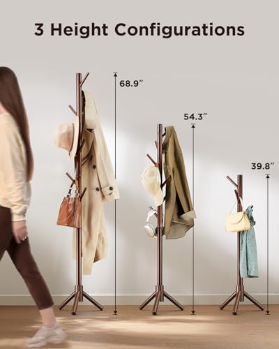 AMADA HOMEFURNISHING - أمادا هومفورنيشينج حامل معاطف خشبي قائم بذاته مع 8 خطافات شجرة معطف 3 اعدادات ارتفاع للمدخل والرواق وغرفة النوم والمكتب AMWCR01