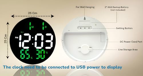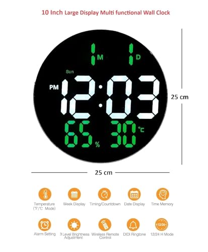 - الميزات التي يمكن توقعها من ساعة الحائط الرقمية: درجة الحرارة المئوية والرطوبة والتاريخ ويوم الأسبوع والمنبه والساعة. توفر شاشة الثواني الوامضة إحساسًا أنيقًا بالعرض.