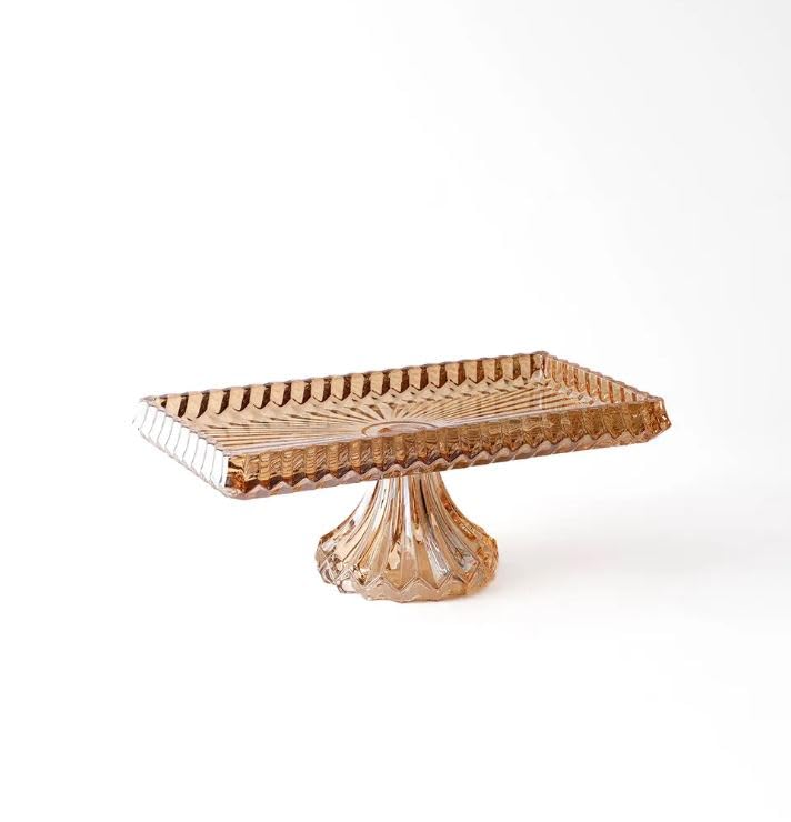Generic - حامل كيك زجاجي، مستطيل الشكل، بقاعدة مرتفعة، مزخرف بنقشة مضلعة، لون كهرمان