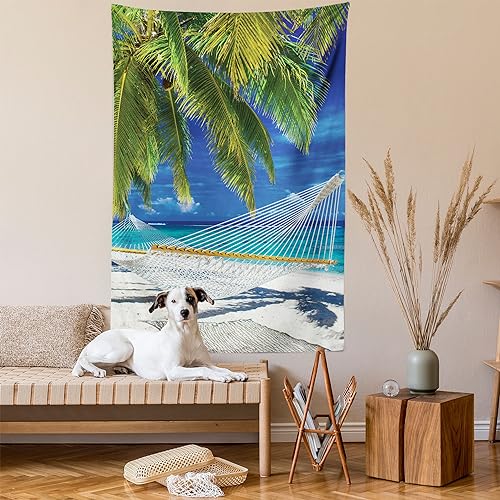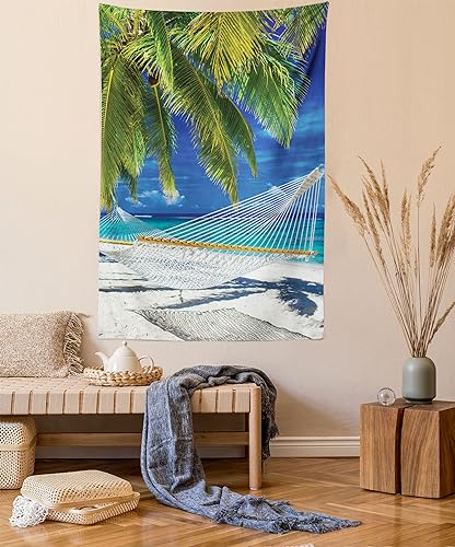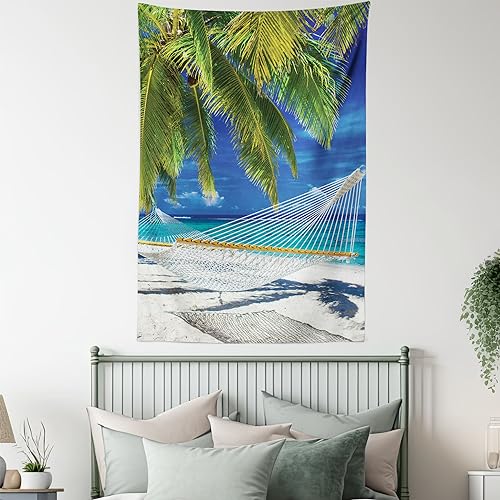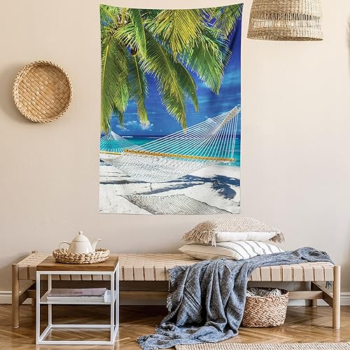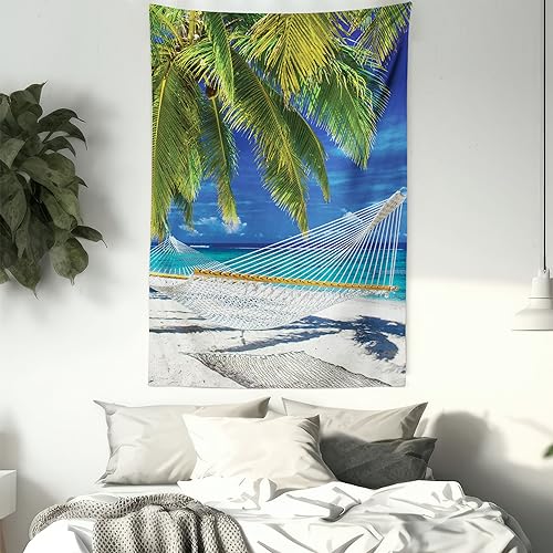 ambesonne - بساط حائط بصورة فنية للطبيعة لارجوحة على الشاطئ الرملي مع نخلة مطلة على البحر من امبيسون، تعلق على الحائط لغرفة النوم وغرفة المعيشة وغرف السكن الجامعي، مقاس 40×60 بوصة، بالوان كريمي كحلي واخضر