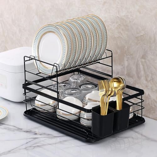 Generic - مطبقيه مطبخ أمريكية مزدوجة باللون الأسود لتجفيف الصحون والأطباق منظم زجزاج قوي التصريف حامل دورين أنيق وعصري