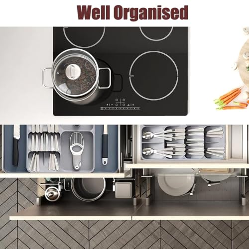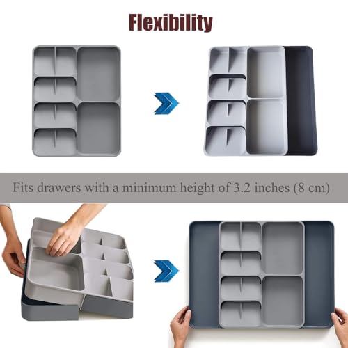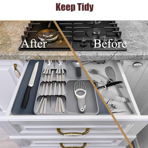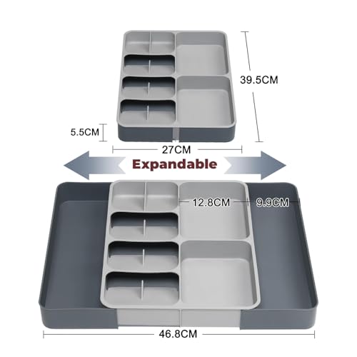 - [سهل التركيب والصيانة] منظمات المطبخ الفضية 2 في 1 للأدراج سهلة التركيب والفك. التنظيف سهل للغاية أيضًا! بعد الغسيل، اتركيه يجف، وسيكون جاهزًا للاستخدام مرة أخرى. التصميم القابل للتوسيع، الذي يتراوح عرضه من 28 سم إلى 48 سم، يناسب مقاسات الأدراج المختلفة أو حتى يمكن وضعه فوق مكتبك لمزيد من التنوع