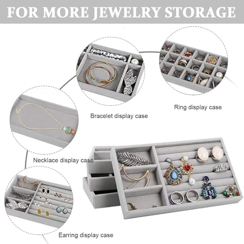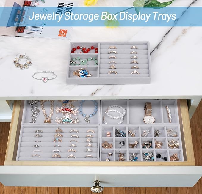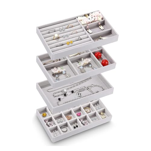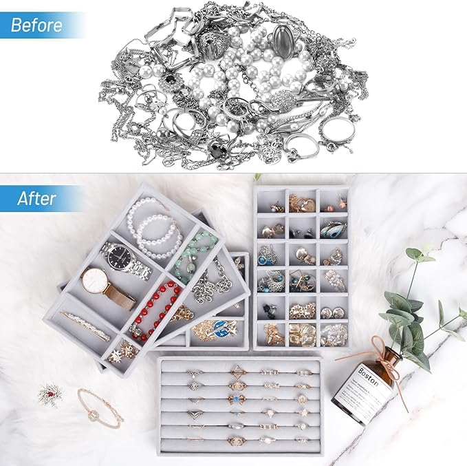 - حافظ على مجموعة مجوهراتك منظمة - تساعدك هذه المجموعة المكونة من 4 صواني مجوهرات على منح مظهر أنيق ومنظم من خلال ترتيب مجوهراتك المتناثرة والحفاظ عليها. مصنوعة من مادة بدرجة رمادية اللون تعرض كل شيء بشكل مثالي، من الحلقان والخواتم إلى السلاسل والبروشات.