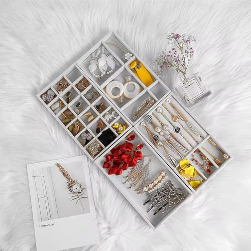 - صينية لتنظيم المجوهرات وعرضها تتميز بفواصل قابلة للإزالة وتعد من اكسسوارات الدرج ودولاب الملابس لعرض وتنظيم الأدوات والحلقان والخواتم ومستحضرات التجميل والسلاسل والسوار، مجموعة من 4 قطع