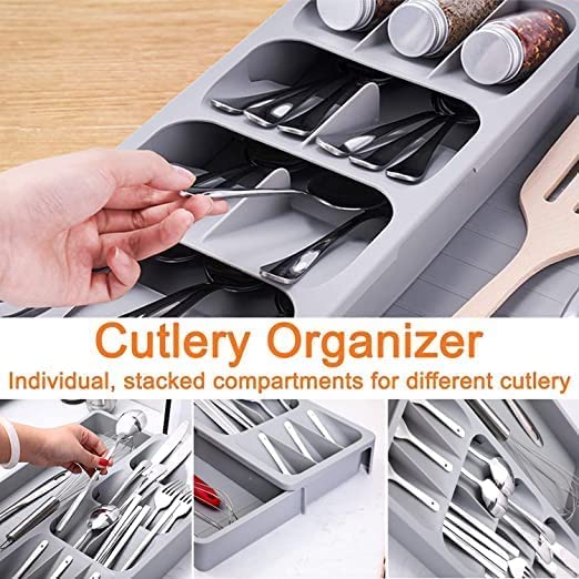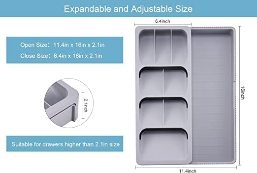 AMERTEER - منظم درج من اماتير مطبخ قابل للتوسيع، حامل تخزين المطبخ، منظم أدوات المائدة والشوك والمعالق (رمادي)