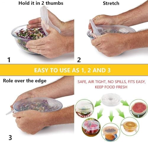 - تخلصي من التغليف البلاستيك الرخيص - استخدمي أغطية السيليكون المرنة لتغطية بقايا الطعام أو الفاكهة بوضعها على البولة أو الطبق. صنعت بالكامل من السيليكون الآمن غذائيًا وخالية من مادة بيسفينول أ. تتميز بأنها متينة وغير سامة ويمكنها تحمل درجات الحرارة الباردة والساخنة حتى تتمكنين من وضعها في الثلاجة أو كغطاء بالميكروويف. حافظ على الفاكهة طازجة أيضًا، من خلال تغطيتها بأغطية من السيليكون.