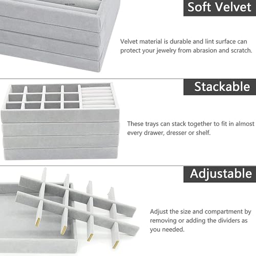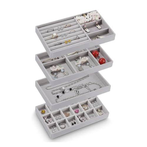 AMERTEER - صينية لتنظيم المجوهرات من القطيفة بحجم كبير قابلة للتكديس من اميرتير، صواني عرض لتخزين المجوهرات للأدراج، للحلقان والسلاسل والأساور والخواتم، طقم من 4 قطع، رمادي، 21 × 12.5 × 2.5 سم