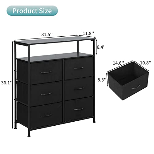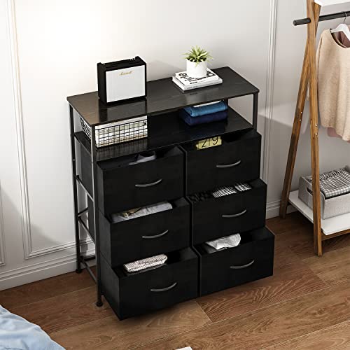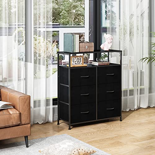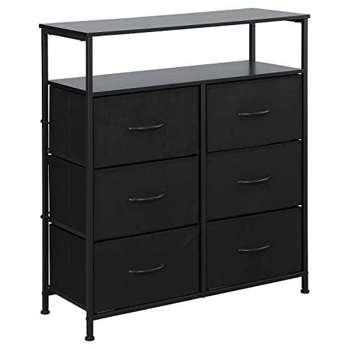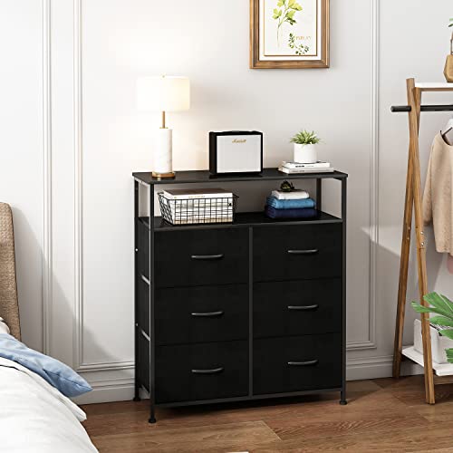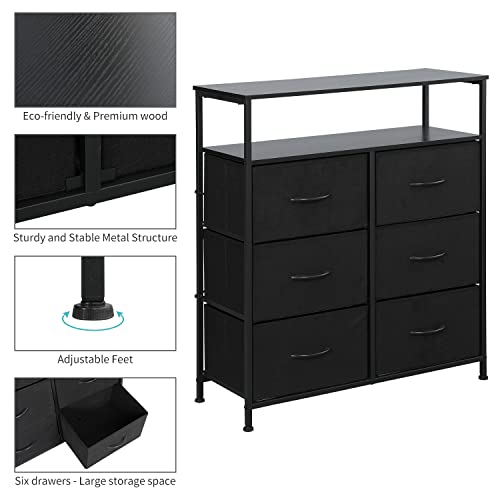 AMISEN - خزانة ملابس قماشية مع 6 أدراج من اي ام اي اس اي ان، خزانة أدراج مع رفين خشبيين، وحدة تنظيم وظيفية طويلة للخزانات وغرفة النوم والرواق، اسود