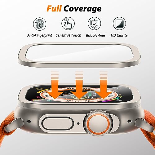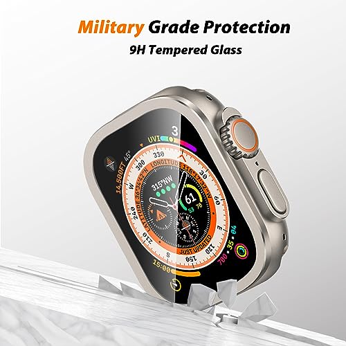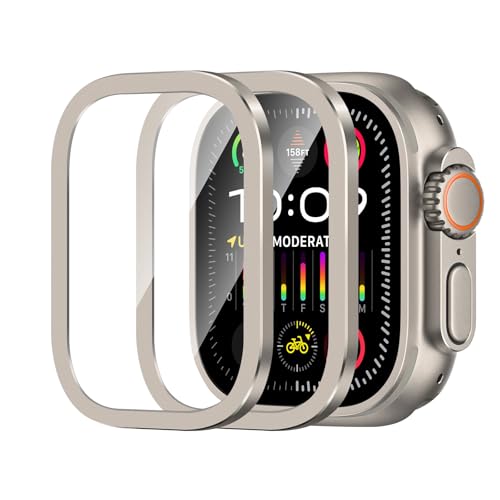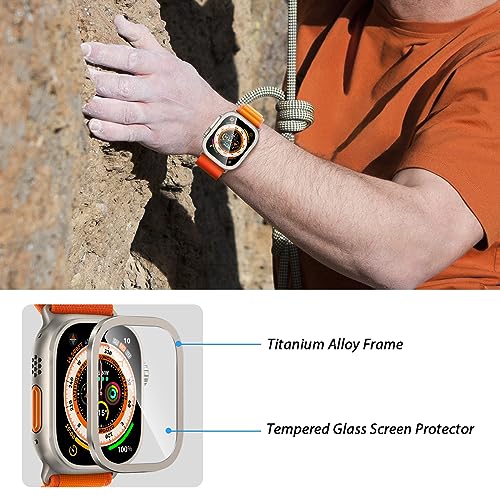 Amizee - جراب حماية معدني مصنوع من الزجاج المقوى عالي الدقة HD متوافق مع ساعة آبل آي ووتش آلترا 49 ملم اميزي إطار مدمج لون تيتانيوم عبوة قطعتين أصلي