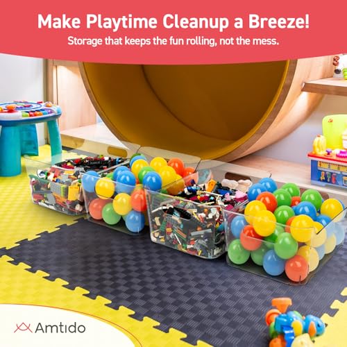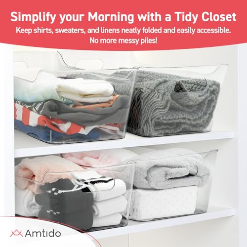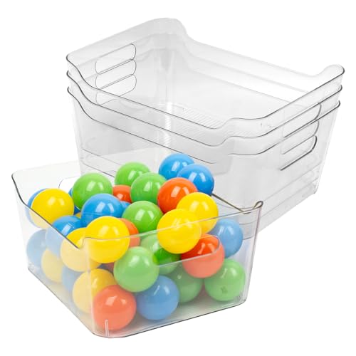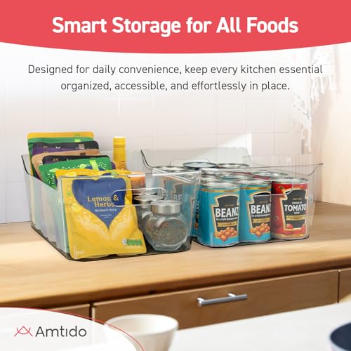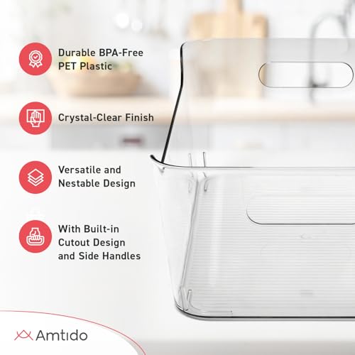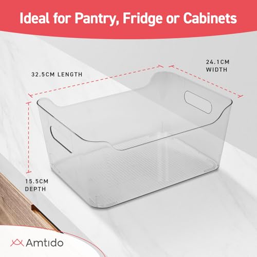 Amtido - منظم تخزين بلاستيكي شفاف - منظمات ثلاجة متينة وخالية من البيسفينول أ، مع مقابض - علبة تخزين قابلة للتكديس للمطبخ والثلاجة والحمام، من امتيدو، 4 قطع (32.5 × 24.1 × 15.5 سم)