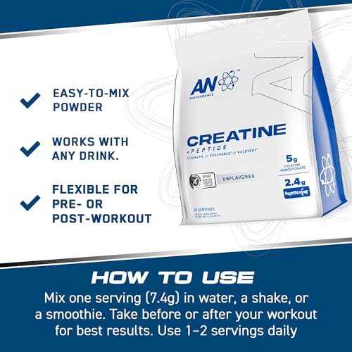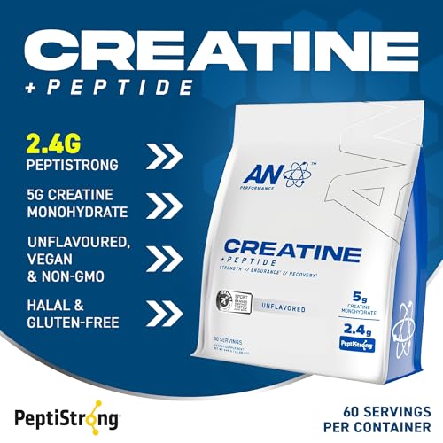 AN - مكمل كرياتين مع الببتيد غير منكه بوزن 5 جم كرياتين مونوهيدرات و2.4 جم بيبتي سترونج خالي من الجلوتين منخفض الكربوهيدرات ومنخفض الدهون مناسب للكيتو من ايه ان | 60 حصة