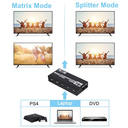 - مصفوفة HDMI 3x2: يستطيع محوّل مصفوفة HMDI توصيل ثلاث مصادر إشارة بدقة 4K، بقنية المدى البعيد العالي (HRD) بشاشتين أو جهازَي عرض عالي الدقة، كما يمكنه أيضًا استخراج إشارة الصوت من مدخل HDMI عبر مخرج ألياف ضوئية بصيغة توسلينك SPDIF أو عبر مخرج سماعة رأس ستيريو مقاس 3.5 مم. يمكن التحكم في مصفوفة HDMI 3×2 هذه عن طريق جهاز التحكم عن بعد بالأشعة تحت الحمراء والزر المحلي. يسمح بتبديل 3 أجهزة إخراج HDMI أو تقسيمها بسهولة إلى شاشتين أو أجهزة عرض متوافقين مع HDMI.