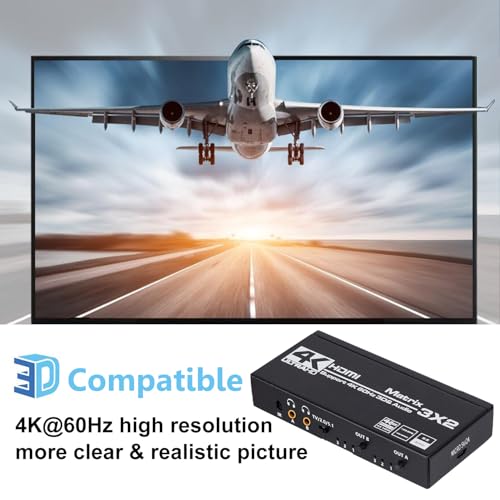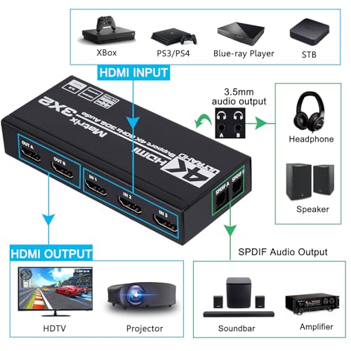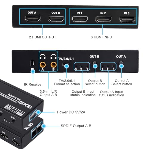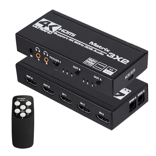 Anber-Tech - انبر-تيك محول مصفوفة HDMI 3×2، 4K HDMI مصفوفة 3 في 2 صندوق مقسم مع مستخرج EDID وجهاز تحكم عن بعد بالأشعة تحت الحمراء، يدعم الترا 4K HDR، 4Kx2K@60Hz، 3D/1080P، HDMI 2.0b، HDCP 2.2