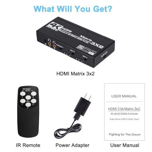 - ما تحصل عليه: 1 × مصفوفة HDMI 3x2، 1 × دليل المستخدم (استخدام اللغة العربية غير مؤكد)، 1 × محول طاقة، 1 × جهاز تحكم عن بعد بالأشعة تحت الحمراء، -